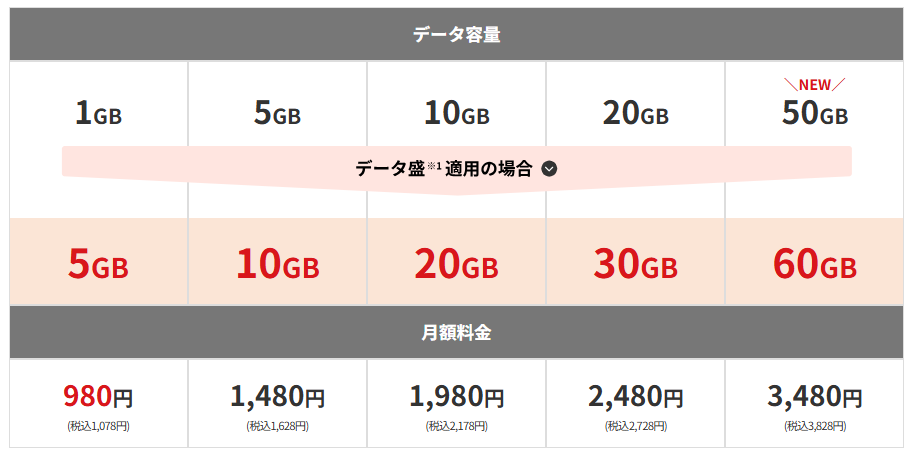 通常料金はMNVOの中ではそれほど安い訳ではありませんが、“データ盛”を利用すれば、他のMNVOよりお得に月額料金を抑えられます。