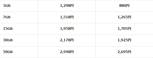 - ~3GBは1,078円、無制限でも3,278円と安価
