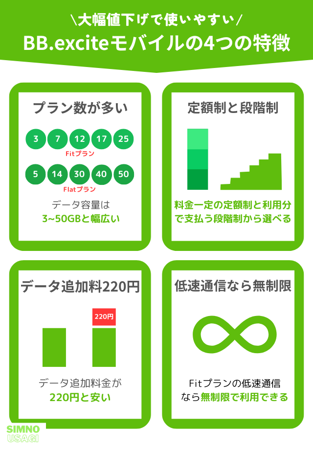 BB.exciteモバイルは小容量~中容量のFitプラン(定額制)と小容量~大容量のFlatプラン(段階制)の2つに分かれていて、Fitプランは小容量向け、Flatプランは中~大容量向けとなっています。